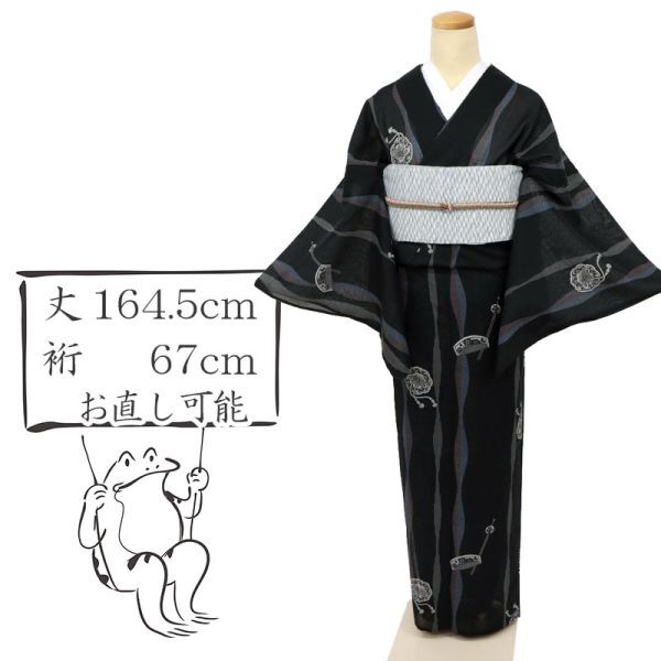 - 【小紋】 長尺 洗える夏着物 立涌に鏡かんざし櫛 黒 化繊着物 KB7-65