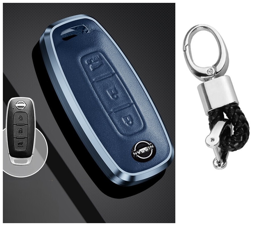- 新品即決 送料無料 日産 アルミ 紺 本革 スマートキーケース キーカバー キーホルダー ニッサン エクストレイルT33系 サクラ アリア B9