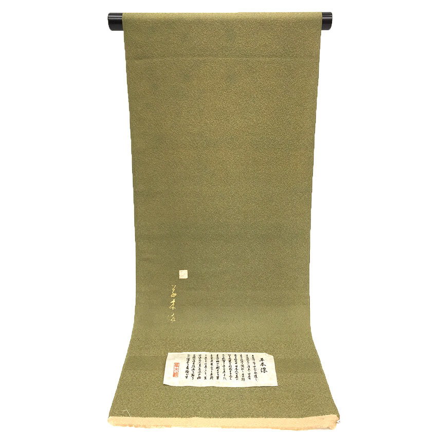 | PRコメント | 特選草木染落款有りの鮫小紋反物着尺のご紹介です。 小紋の中でも特に格調高いとされる「小紋三役」ひとつ、鮫小紋。 数千種あると言われる江戸小紋の文様の中でも特に多くの文人・茶人に愛されてきた鮫小紋。 江戸小紋の「上品さ」に「粋」な情趣をプラスした大人の女性におすすめしたいお着物です。 落ち着きのある草木染ならではの優しい色合いの草色に、無地に見えるほど緻密な青海鮫の意匠があらわされました逸品です。 さらりと心地よい絹地と飽きのこない細かく繊細な柄行きは生地に溶け込むように奥深く、大人の女性の気品と小粋さを演出します。 袷の着物にはもちろんのこと、単衣仕立てのお着物にもおすすめいたします。お好みの仕立て方でおたのしみくださいませ。 こちらは未仕立て・未使用品ですが全体的に色むらがみられるためSAランク表記、訳ありスーパーセール価格にて販売です。
