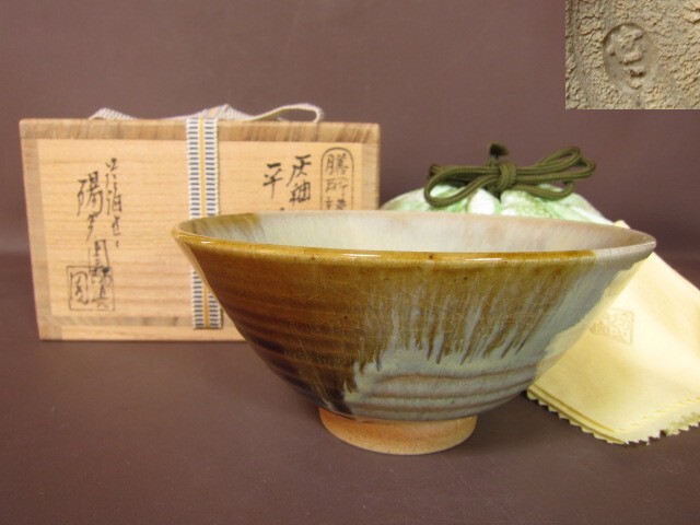 > 期間限定!送料無料!11月末まで!膳所焼 灰釉平茶碗 武者小路千家十代 有隣斎 花押 銘 松菊 ☆318