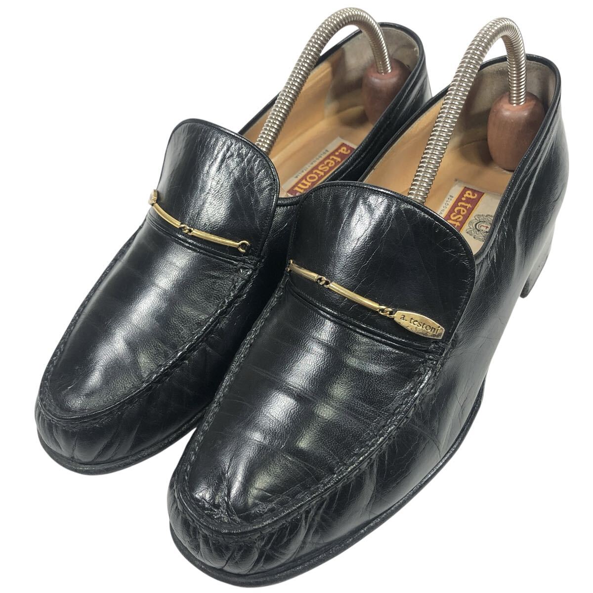 - 【ア・テストーニ】本物 a.testoni 靴 25cm 黒 ロゴ金具 ローファー スリッポン ビジネスシューズ 本革 レザー 男性用 メンズ 伊製 6 G