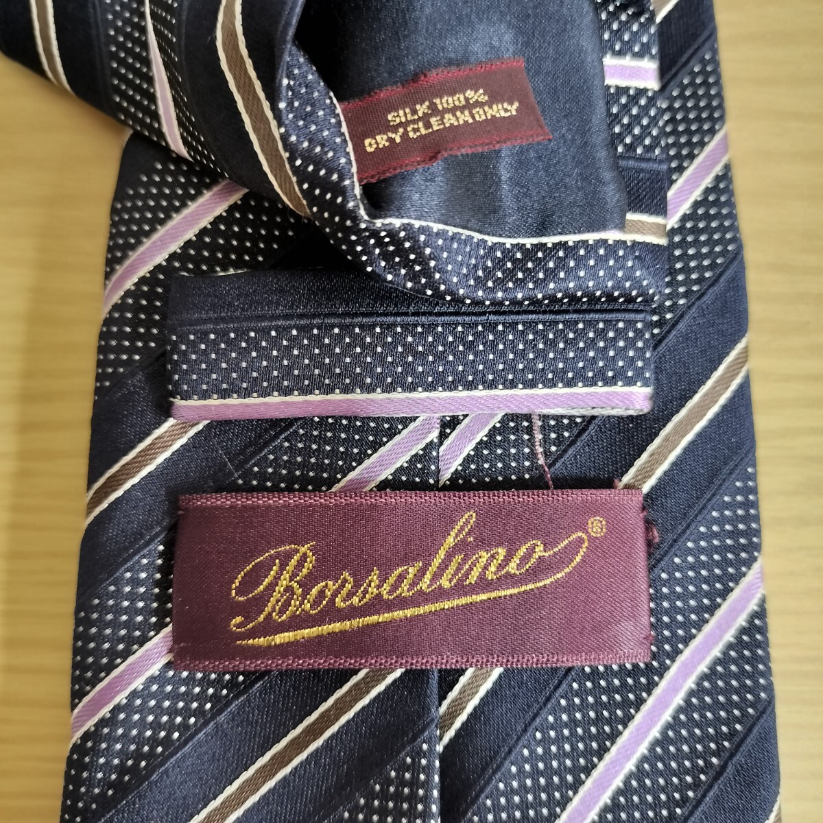 - Borsalino(ボルサリーノ)ダーク紺色ラベンダー茶線ストライプネクタイ