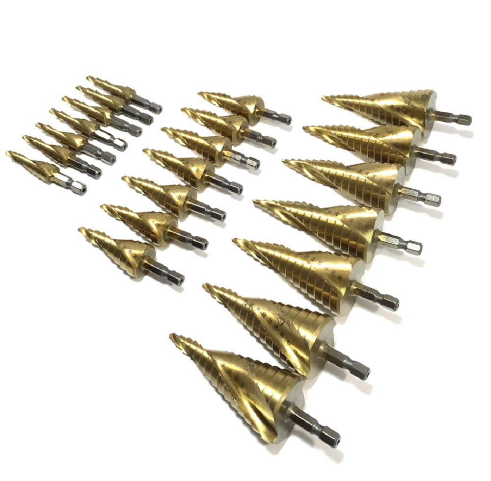 - スパイラル 螺旋 ステップ ドリル チタン コーティング 21本セット 六角軸 タケノコ 穴あけ DIY 工具 ドリルビット
