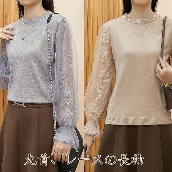 - [ANCKDOCE] レディース セーター ニット 長袖 薄手 トップス レーススリーブ クルーネック ピュアカラー ファッション 春秋冬 GLAY