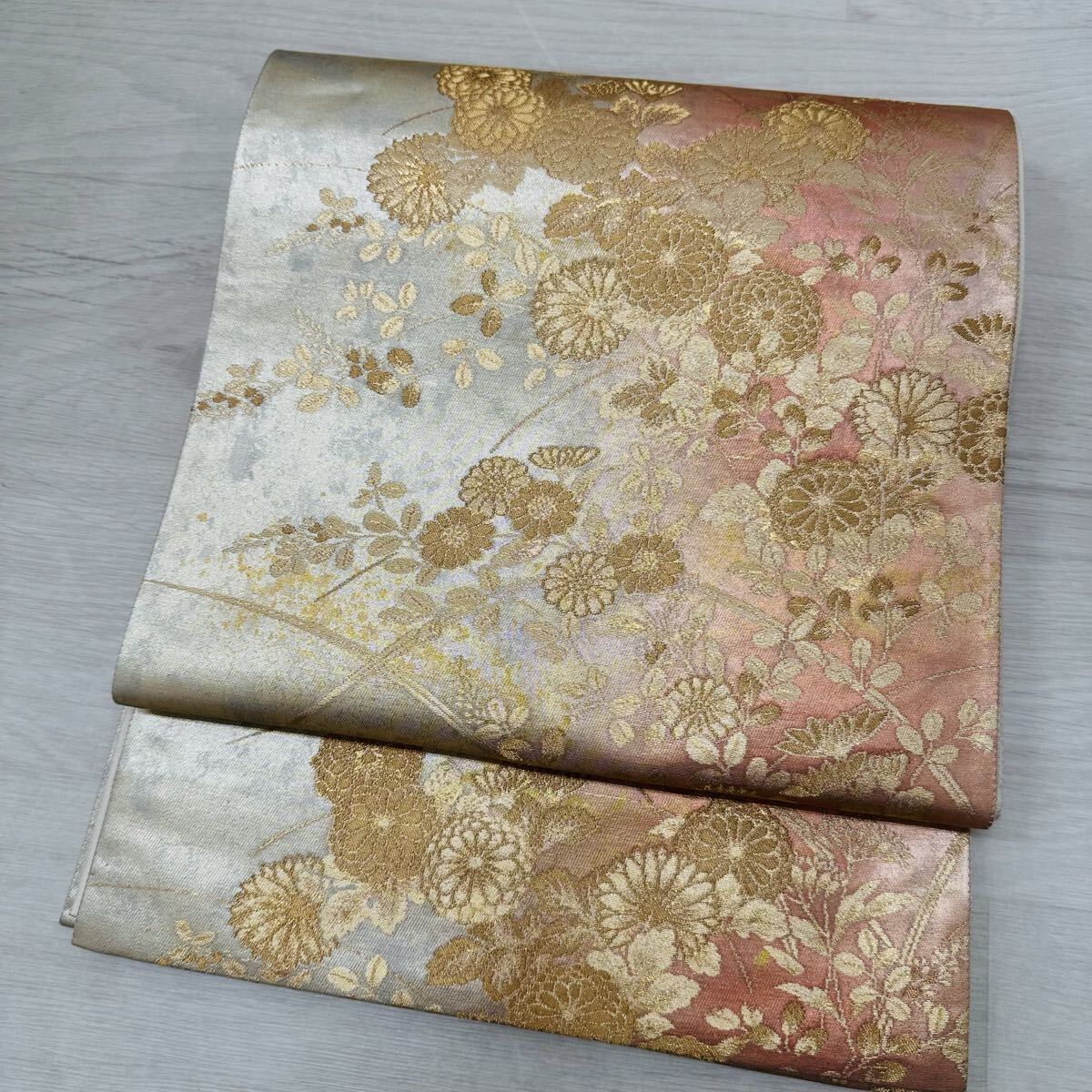 > 袋帯 蒔絵草花文 引き箔 グラデーション 正絹 着物 W-3828