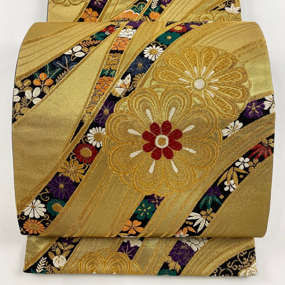 > 袋帯 美品 秀品 菊 松竹梅 唐織 金糸 金色 六通 正絹 【中古】