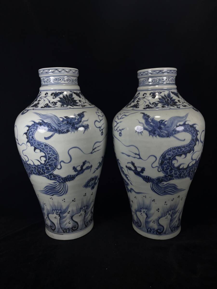 > 8~QN7820 中国磁器 陶芸 磁器『元鯖龍紋広口瓶です』施釉陶 古代工芸品 陶芸 精美彫 置物 收藏品