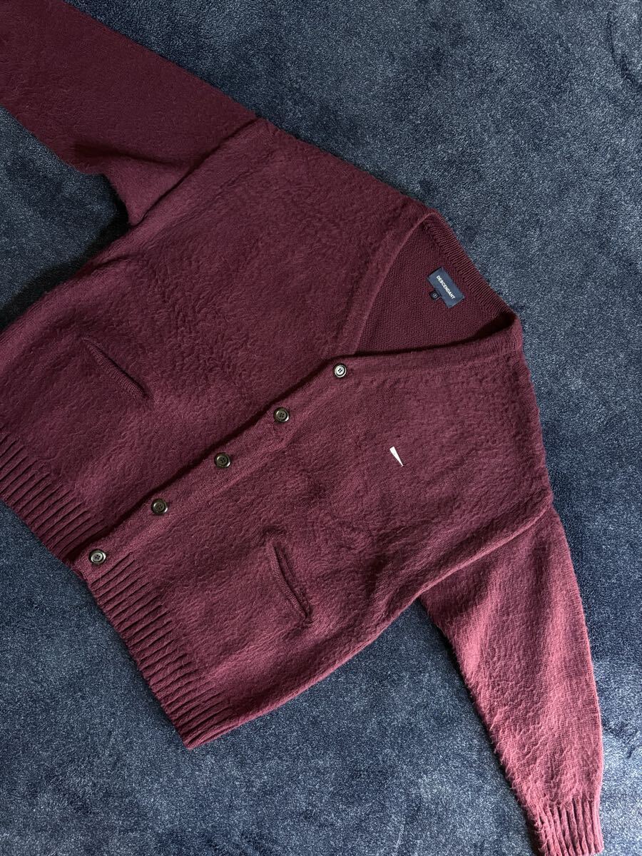 > 美品 ディセンダント DESCENDANT ワンポイント刺繍ロゴ ヘビーウエイト生地 ドロップショルダー カーディガン size1(M相当)ワインレッド系