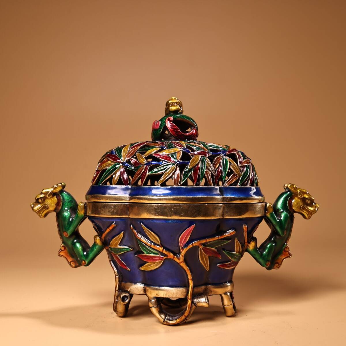- 『館蔵珍品 銅製 景泰藍 琺瑯彩 雙耳 竹節熏香炉 置物 賞物』稀少珍蔵品 古賞物 貴重物品 収蔵品 中国古美術 時代物 古董品