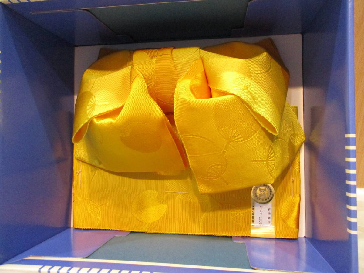 - 浴衣帯 ゆかた帯 作り帯 ワンタッチ イエロー うちわ柄 可愛い レーヨン100% 日本結び帯協同組合 新品未使用品 箱入り