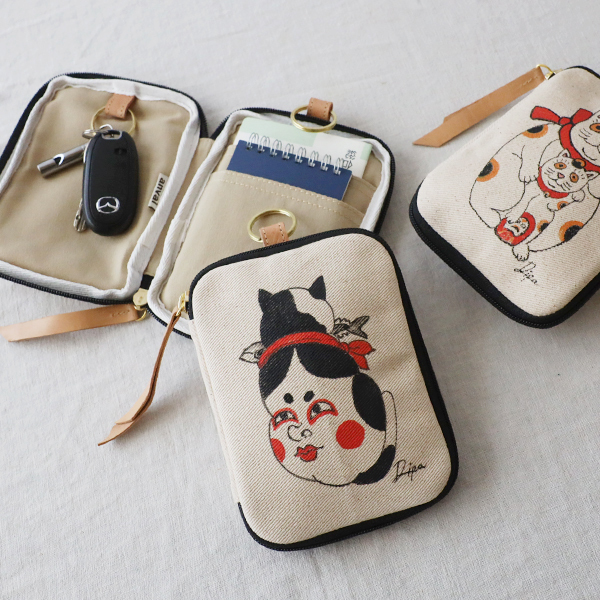 - 送料無料 芸術の秋SALE Mサイズ 手描きART クッション 生成りデニム キーケース 通帳ケース 猫 おかめさん ポーチ S03B