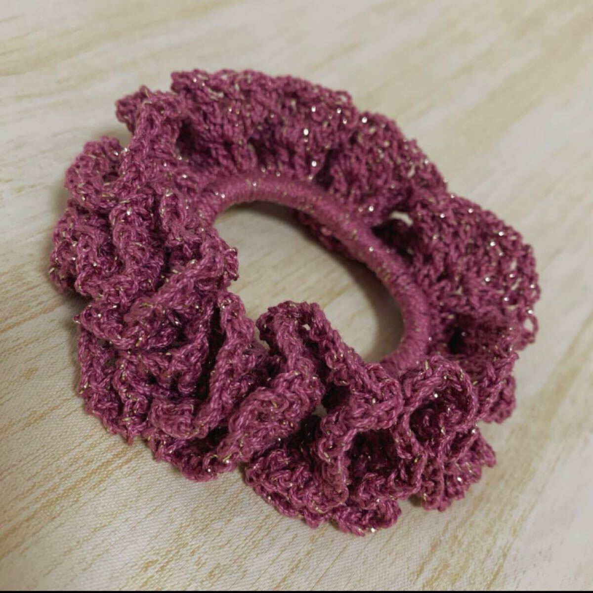 - 【d12】かぎ針 ゴールドラメ くすみピンク レース糸 フリル シュシュ
