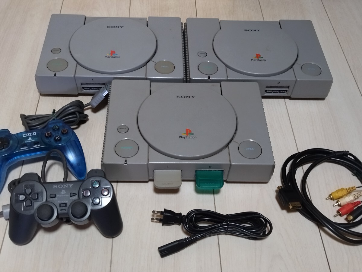 - 即決PS1 初代プレイステーション1本体一式 3台 メモリーカード2枚 アナログコントローラー ホリパッド S端子ステレオケーブル 電源ケーブル