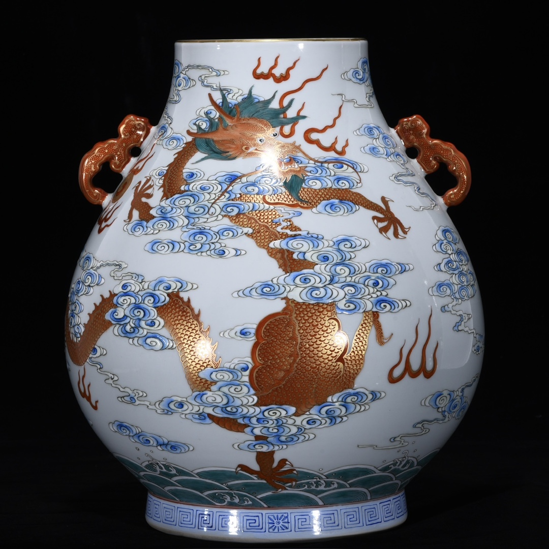 - TM8#7984【3.1】中国骨董 人間国宝 磁器【清乾隆粉彩蒔金竜紋双耳尊】工芸品 施釉陶 青花磁 陶芸 精美彫 置物 收藏品