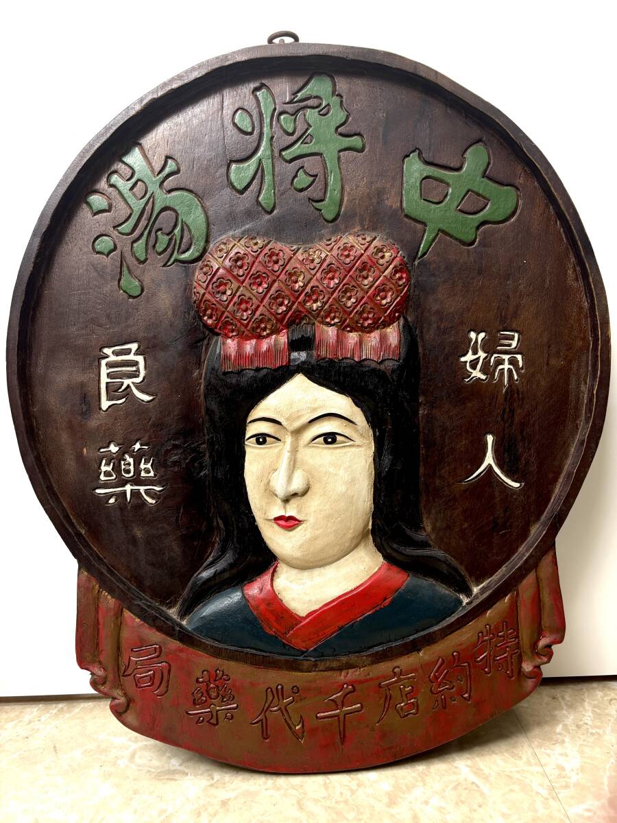 『整理品 中将湯 婦人良薬 特約店千代薬局 1点モノ 木彫り 木製看板 吊り下げ看板 インテリア アンティーク レトロ』拍卖