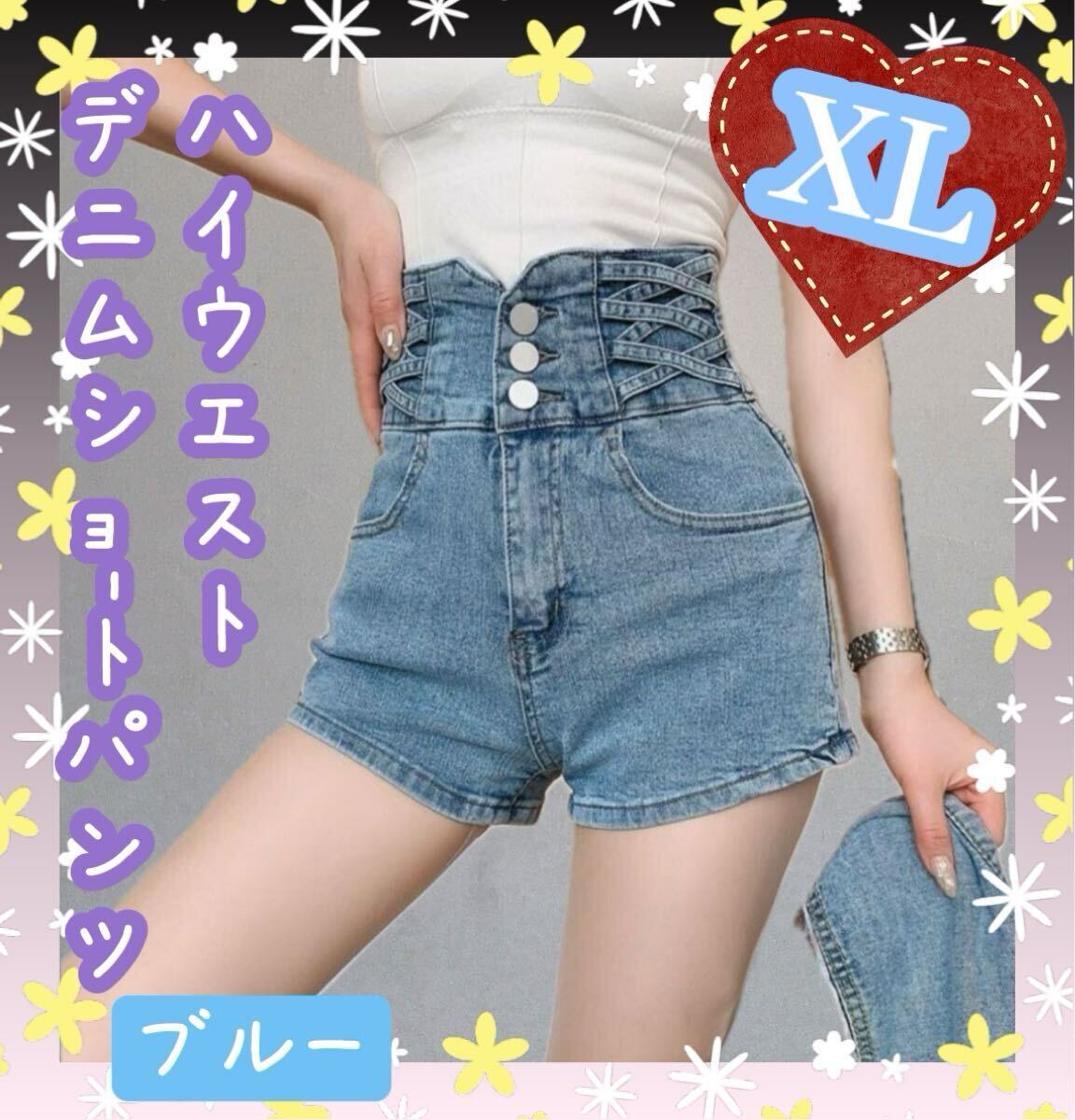 - ハイウエスト クロス デニム ショートパンツ XL ワイド ホットパンツ ブルー
