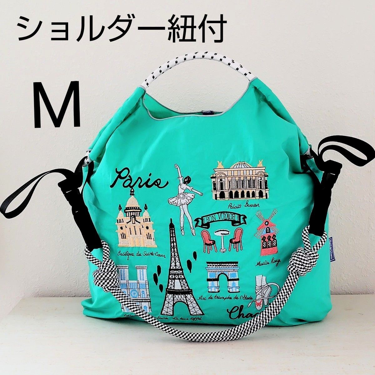 - М パリ Chacott チャコット 刺繍 エコバッグ グリーン ストラップ付き トートバッグ ショルダー