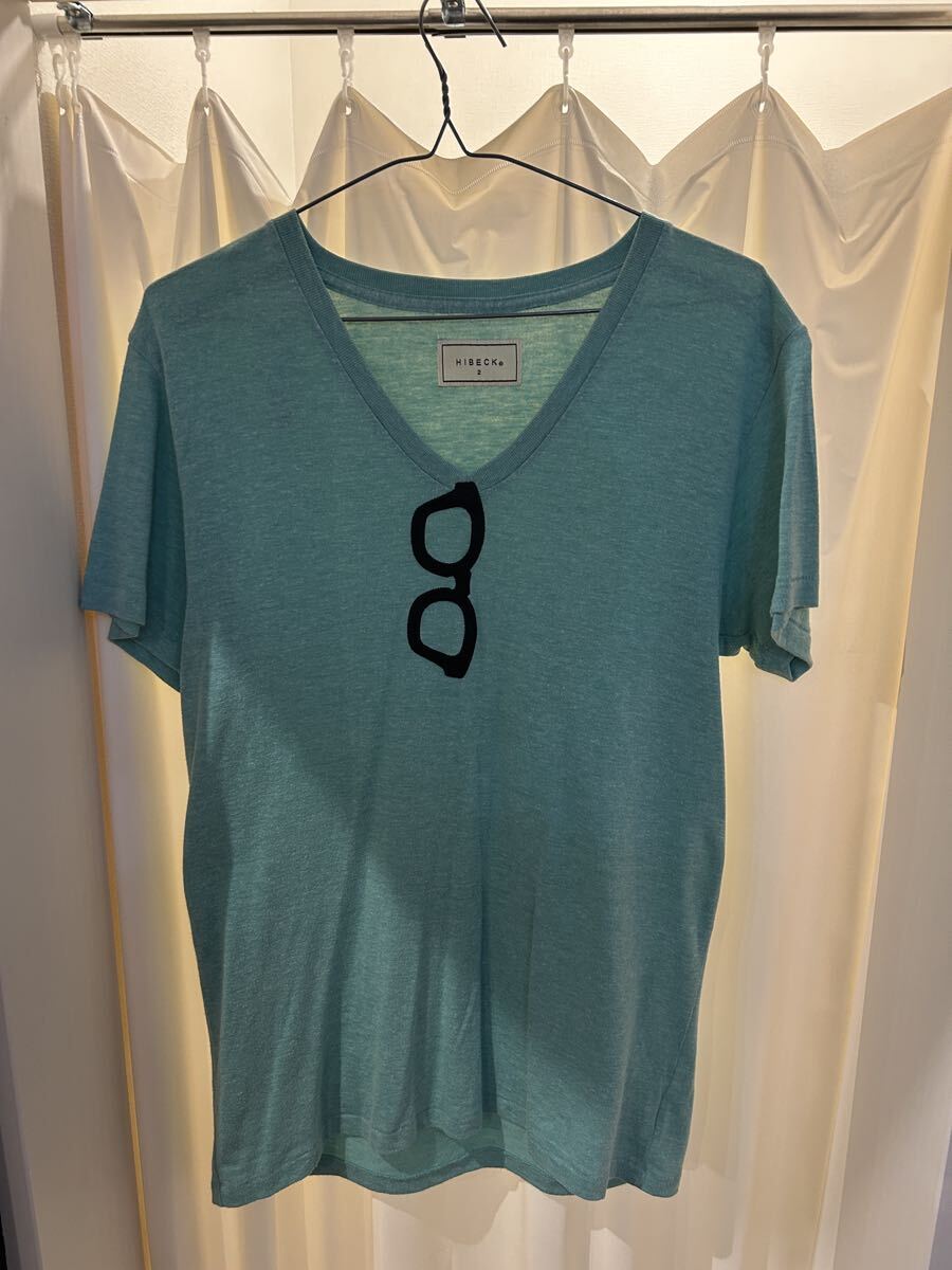 > Y-128 HIBECK 印 Tシャツ 刺繍 メガネ Vネック 半袖 グリーン系 サイズLくらい