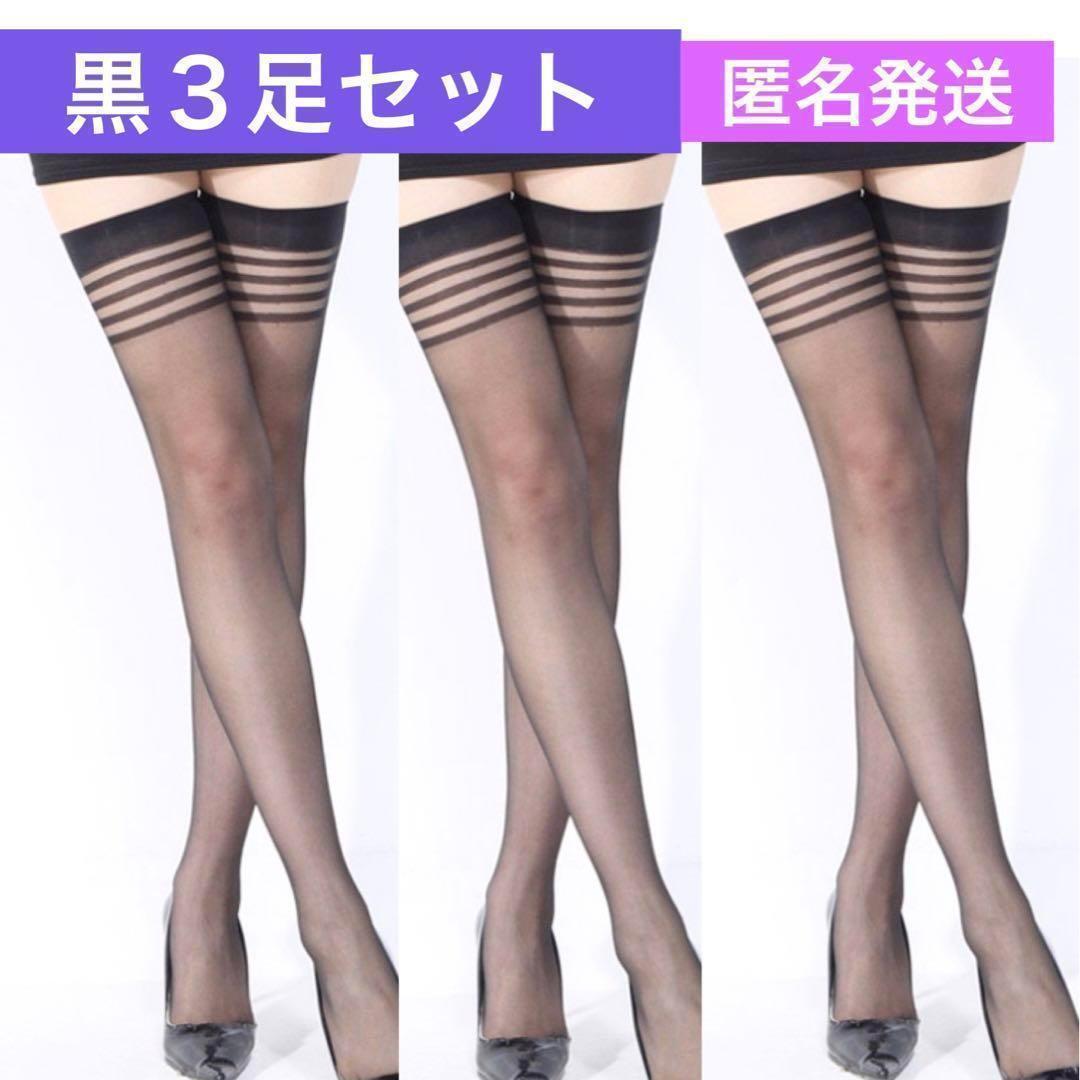 > 3足まとめ売り ニーハイ ガーターストッキング 黒 ブラック ソックス レディース 膝上 オーバニー 太もも丈 タイツ パンスト ライン入り