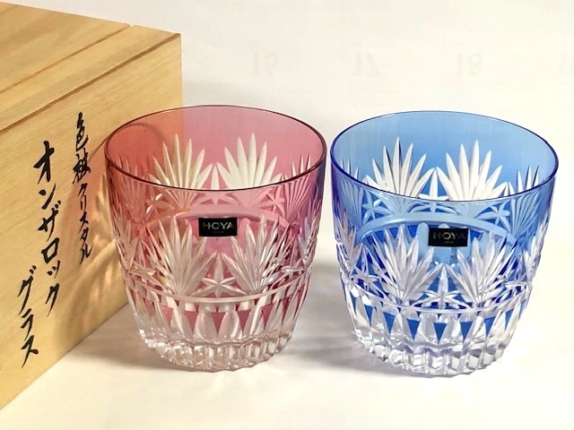- ◎HOYA 保谷 赤・青色被クリスタル 切子 ロックグラス ペアオンザグラス◎共箱z58
