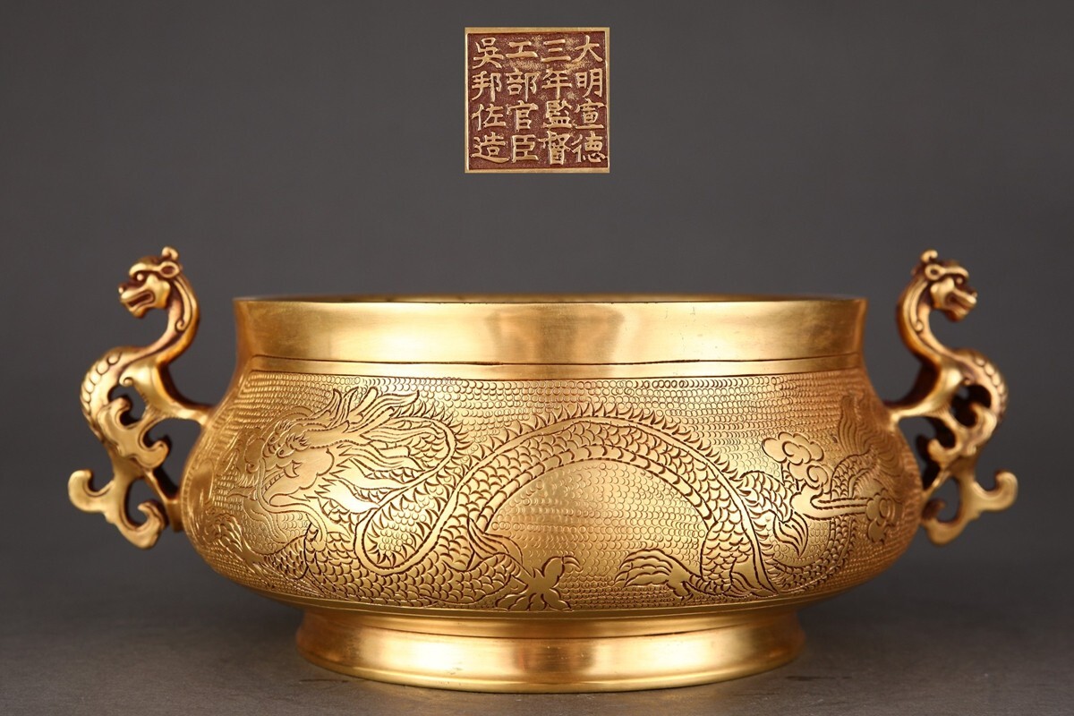 - 「大明宣徳三年監督工部官臣呉邦佐造 古銅彫 塗金雲龍紋 魑龍耳老銅香炉」旧銅器 置物擺件 賞物 中国古美術 旧蔵出