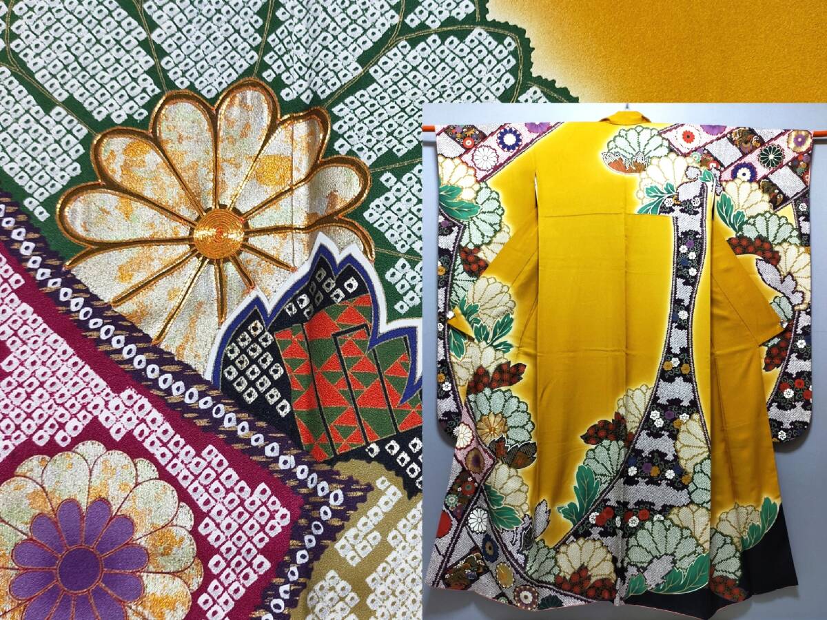 - TA03 着物 袷 正絹 振袖 金駒刺繍 螺鈿箔 菊 熨斗 鹿の子 唐草柄 蘭茶色地 裄丈66cm 身丈1m67.5cm