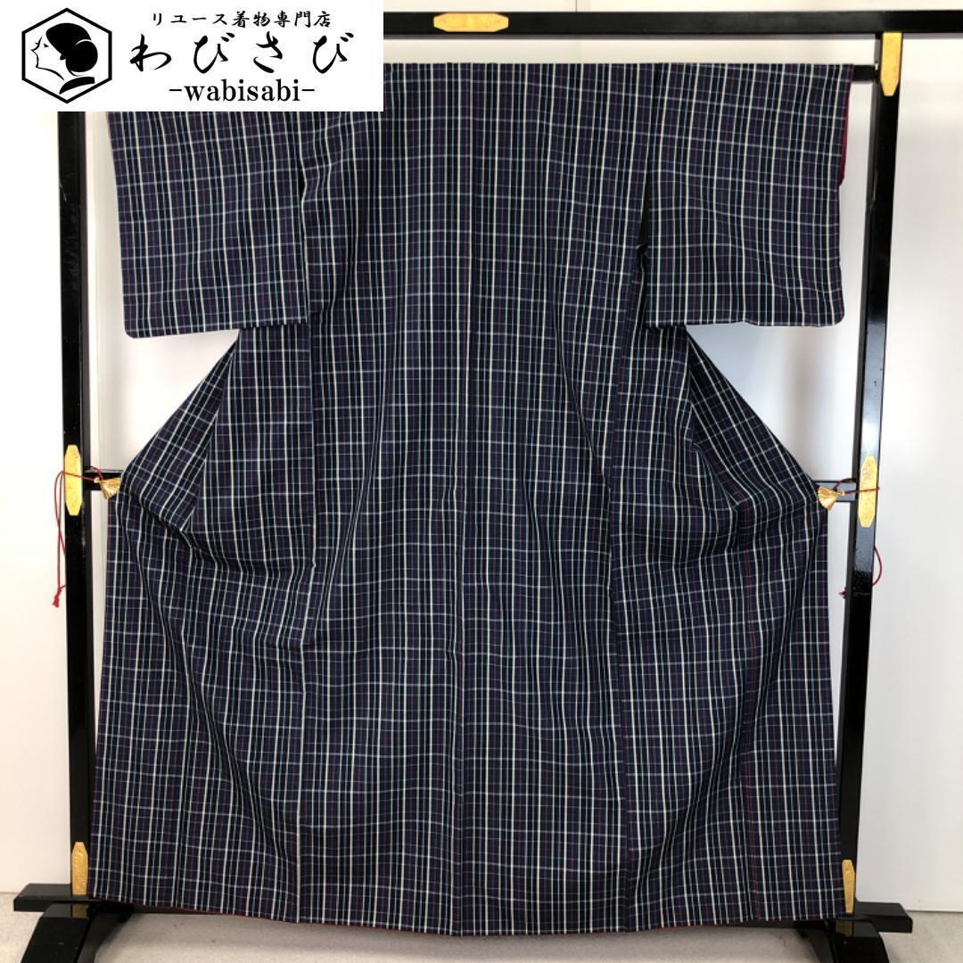 > 紬着物 格子柄 紺色 ガード加工 K-5230 着物 きもの kimono 和服 和装 中古 リサイクル着物 【送料無料】