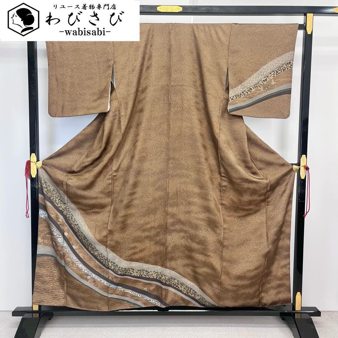 > 訪問着 曲線に花模様 金彩 叩き染 縮緬 伽羅色 K-4074 着物 きもの kimono 和服 和装 中古 リサイクル着物 【送料無料】