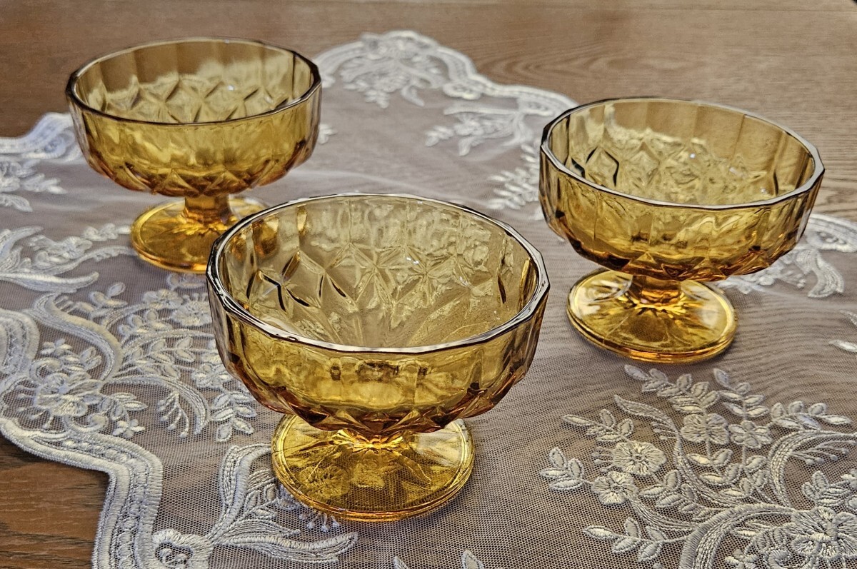 - 昭和レトロ アンバー 脚付き アイスクリームグラス デザートグラス 3個 新品