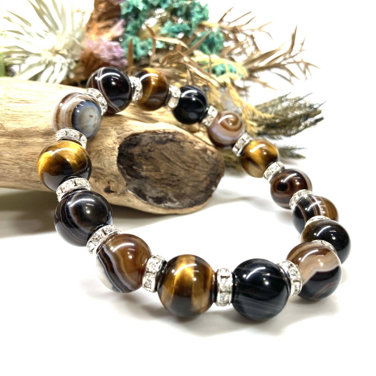 > タイガーアイ&チベットアゲート(天眼石) パワーストーン ブレスレット 天然石ブレス (シルバー) 12mm 金運 仕事運 メンズ・レディース