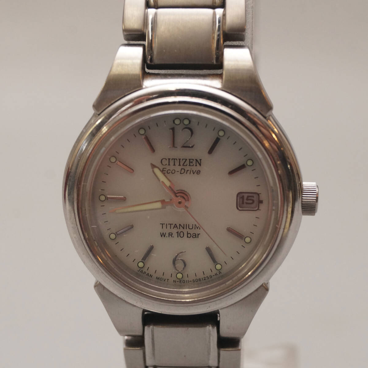 - yd49-CITIZEN シチズン 腕時計 Eco-Drive エコドライブ E011-S036470 コマ・箱付 TITANIUM チタン製 白文字盤 ソーラー電波 デイト
