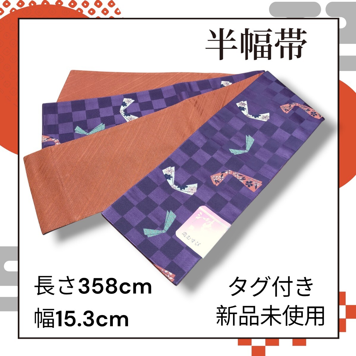 > タグ付き 新品 半幅帯 桔梗色&赤茶色 リバーシブル 小袋帯 浴衣帯 着物帯