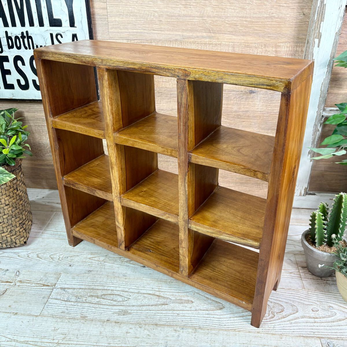 - 送料無料、オールドチーク天然無垢材三段ラックマス(53㎝×51㎝)天然木ナチュラルウッド置台、格子ラック、シェルフ、花台、飾り台