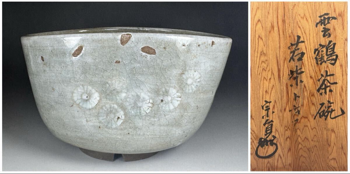 - 李朝 高麗 雲鶴茶碗 銘「若柴」 宗貞書付箱 沓形 時代 茶道具 茶碗 合箱
