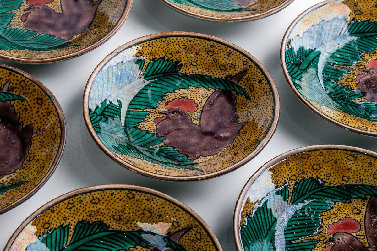 - 【うつわ】 九谷 青手芭蕉鶏文小皿 9客 E2105A バラ売り可能です 古美術 骨董 古玩 唐物 茶道具 懐石 日本料理