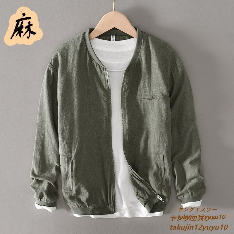 - 超希少◆メンズ リネンジャケット 新品 フライトジャケット 野球服 スカジャン 亜麻 アウター 上着 ジャンパー ブルゾン オリーブ L