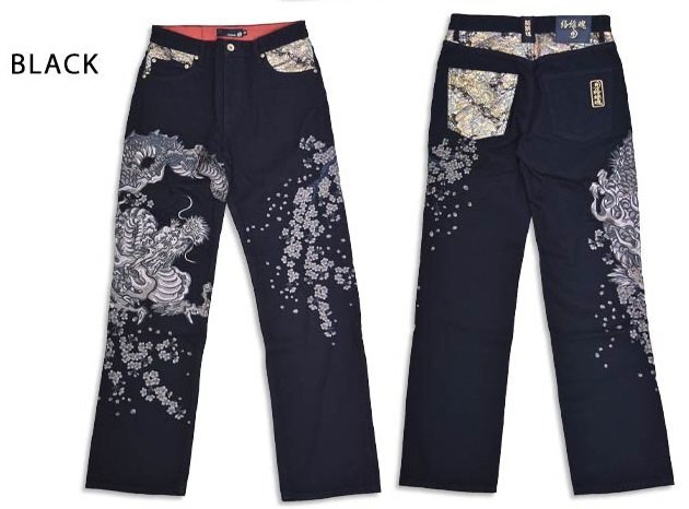 - 粋 古ノ龍デニムパンツ◆絡繰魂 ブラック 36inch 36インチ 253245 和柄 ジーンズ 和風 竜 ドラゴン 桜