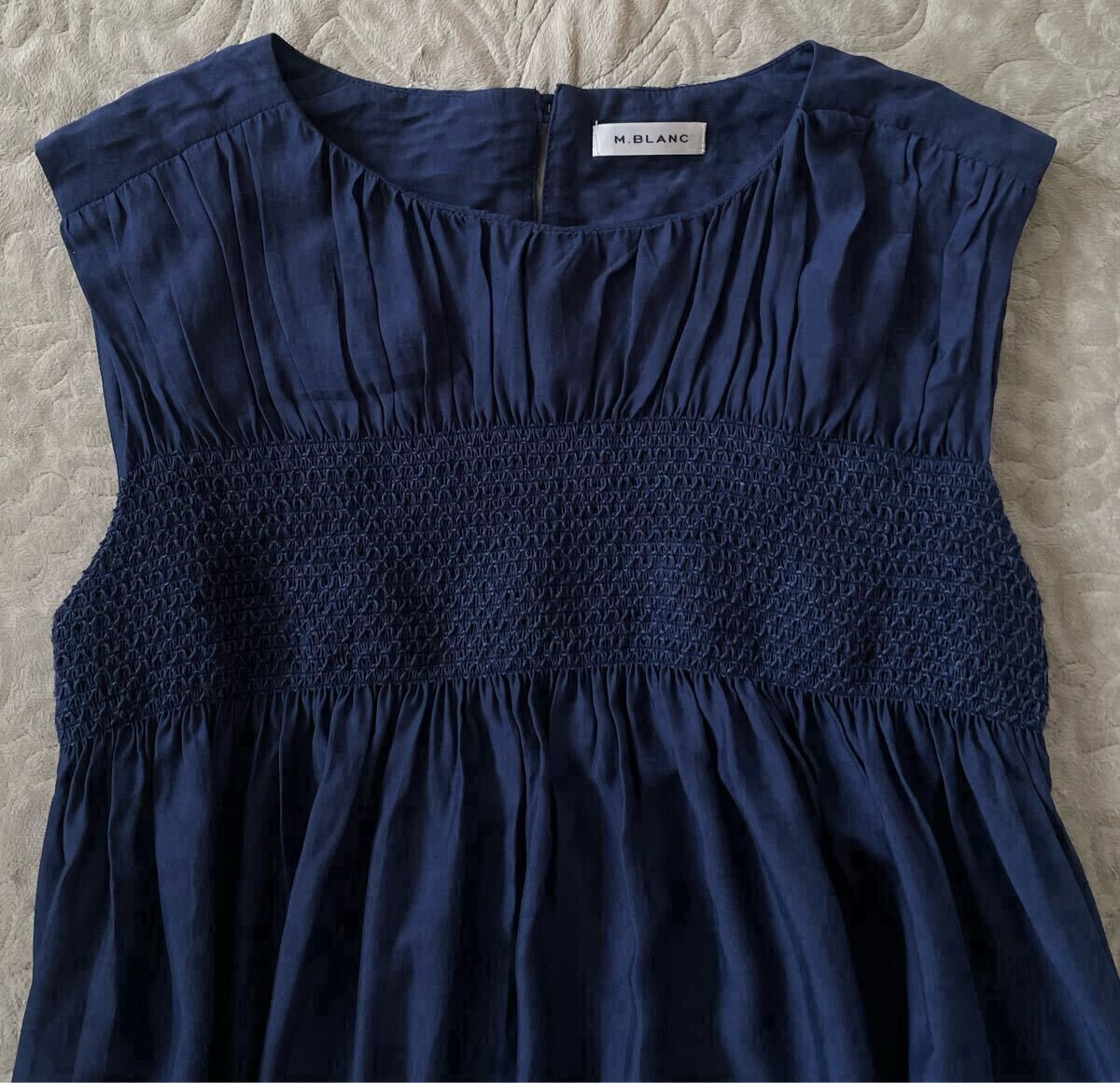 > M.BLANC スモッキング刺繍 ワンピース ノースリーブ ロング 紺 プルオーバー レーヨン ポリエステル 薄手 スリット マキシ ビギ