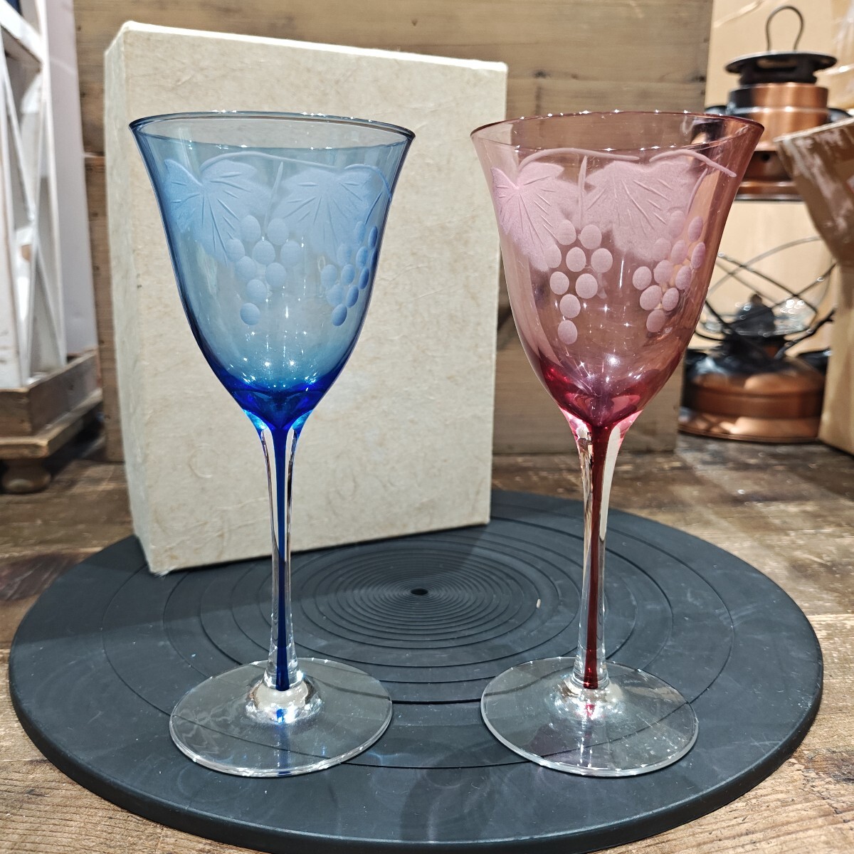 - 90538 日本古風堂 ワイングラス ペア グラス 箱付 葡萄紋 蔦
