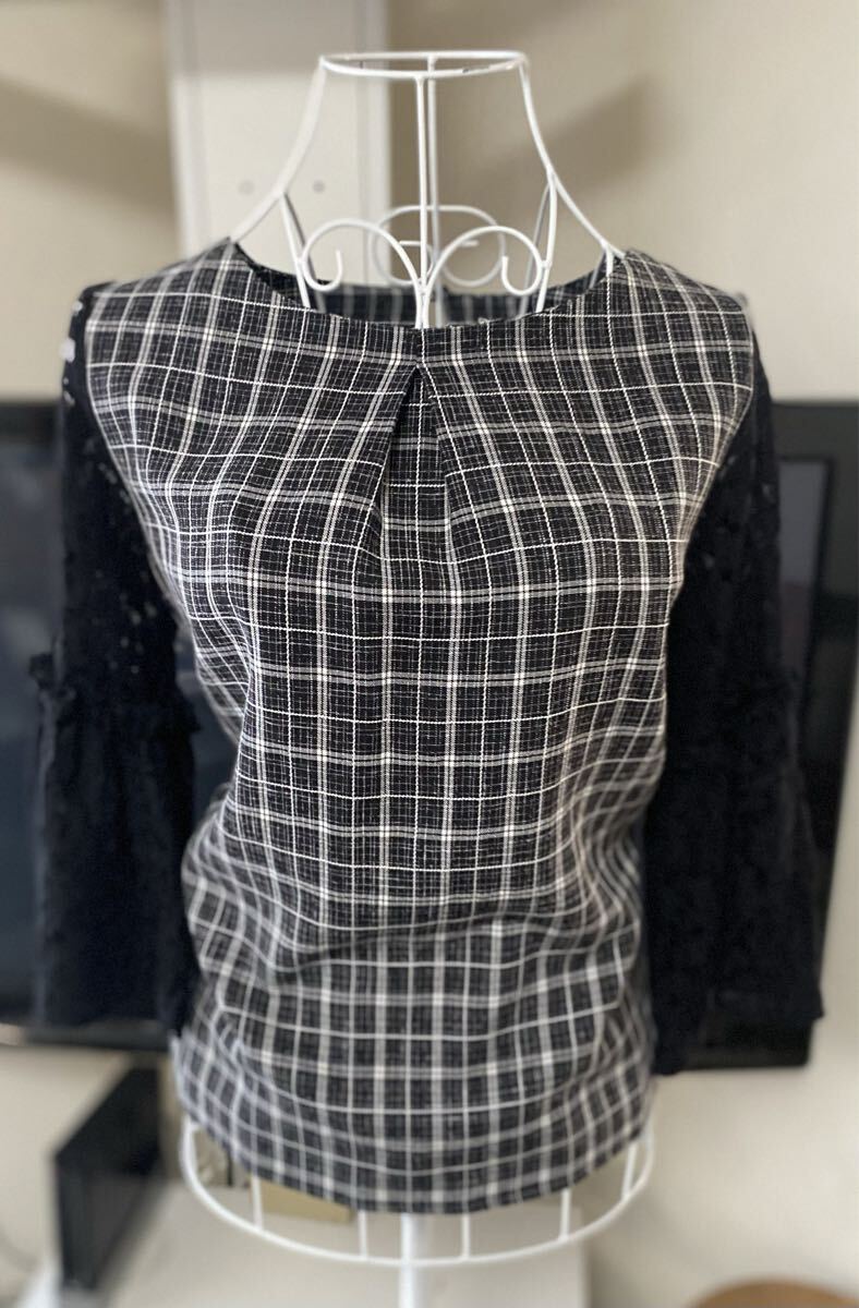 > 美品axes femmeチェック柄 レース袖ブラウス レディーストップス Mサイズ相当