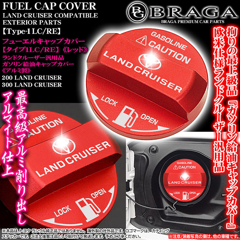 - 200/300系ランクル/タイプ1LC・RE/ガソリン給油フューエル キャップカバー/アルミ製/レッド/LAND CRUISER&Tマークステッカー/客注/ブラガ