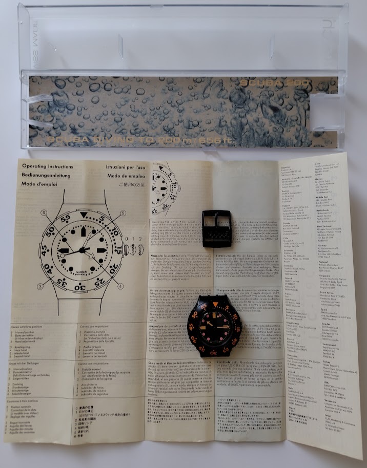 - 【美品】スウォッチ SCUBA200 Barrier Reef SDB100 本体、収納ケース、取扱説明書/保証書 SWATCH スクーバ200 バリアリーフ 初代ダイバー