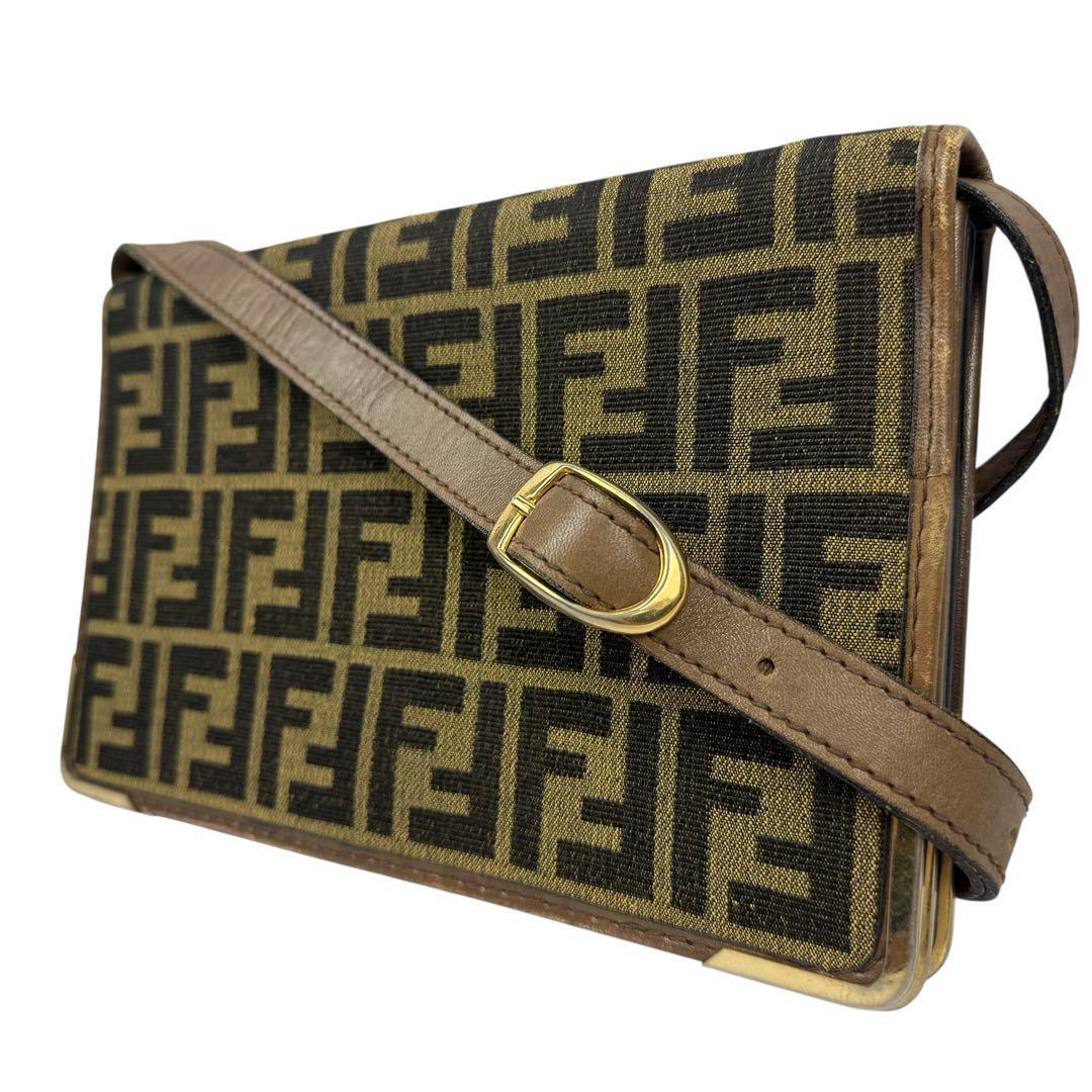 - 【美品】フェンディ FENDI ズッカ柄 FFロゴ ゴールド金具 ショルダーバッグ カバン 鞄 斜めがけ キャンバス レザー カーキ系 ブラウン系