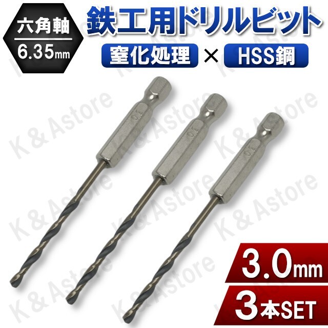 - 六角軸ドリル ビット セット 鉄工用 3mm 3.0mm 3本 ドリル刃 穴あけ 穴開け インパクトドライバー 電動ドリル 金属 木材 工具 ハイス鋼 HSS