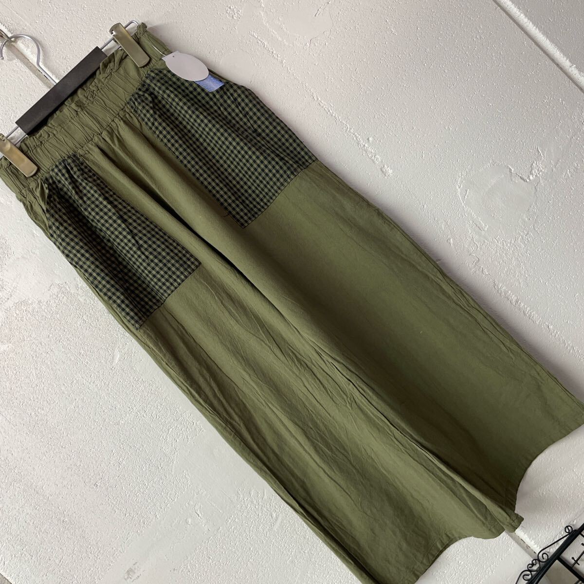 - 綿100%格子柄ポケットセミワイドパンツ グリーン