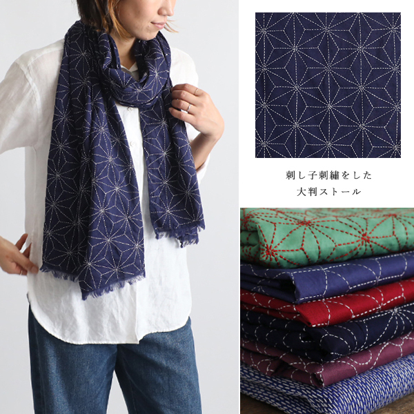- 送料無料 最終SALE 木綿白糸を刺し子した大判ストール ショール マフラー コットン 刺繍 刺し子 インテリア E60O