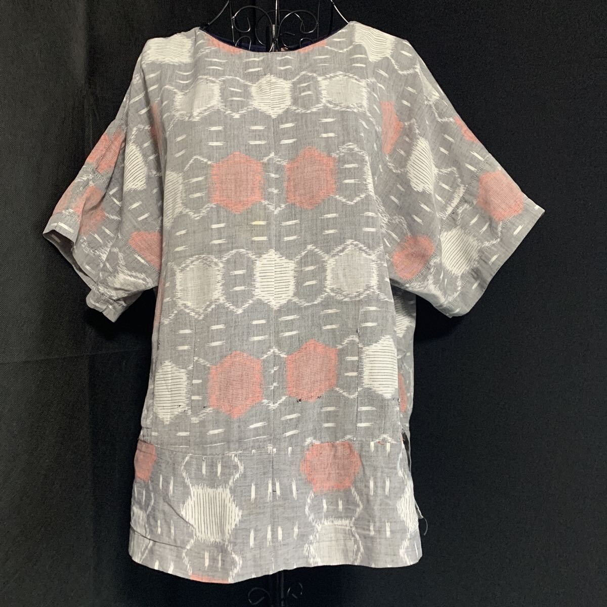> ☆シャツ チュニック 半袖 藍染 生地 刺し子 リメイク 素材 ハンドメイド 古布 型染め 絣 手作り パッチワーク カスリ かすり (A-2993)
