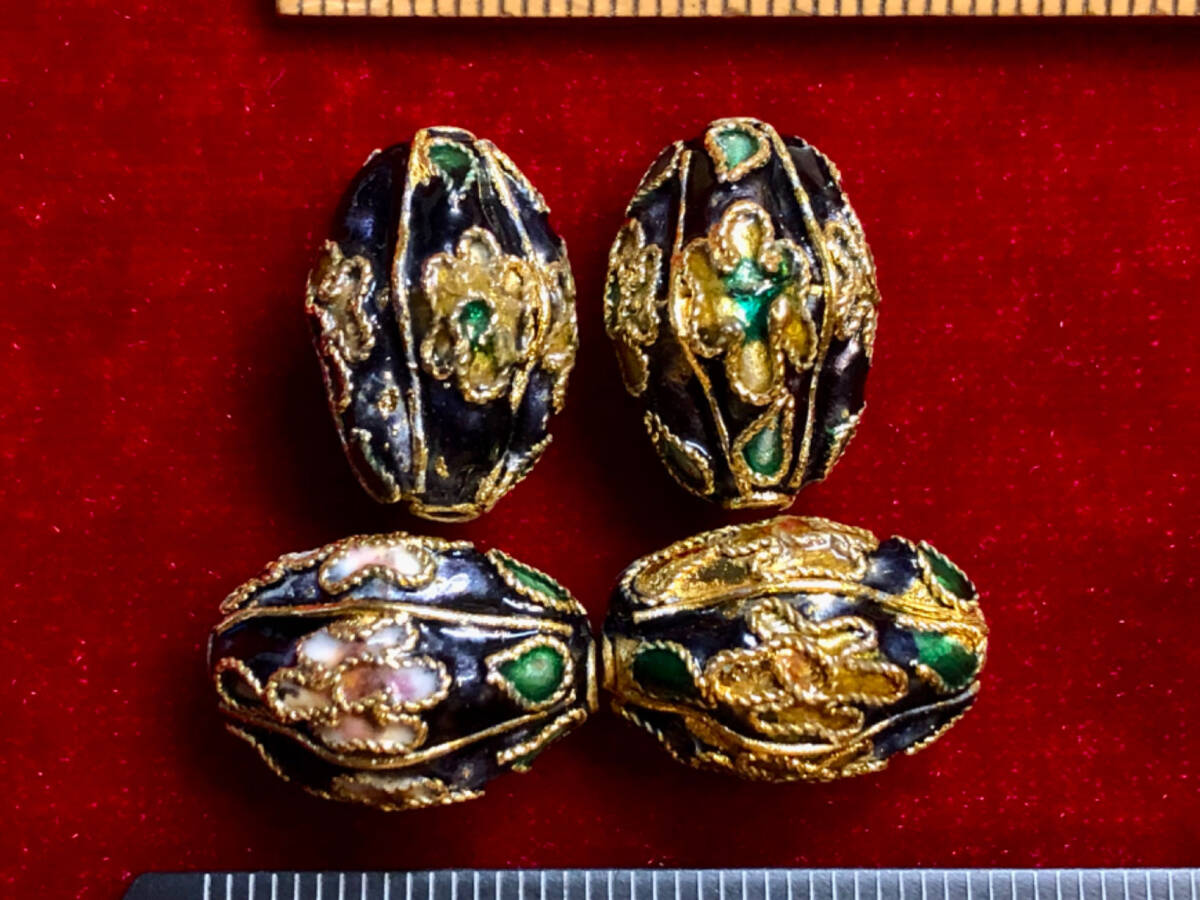 - ¶!¶ 有線七宝焼ワールド - 4個の瓜型玉で1単位 ¶!¶ 約12㎜×17㎜瓜型玉 金線に黒釉緑葉金色花 手作り 手芸 工芸 インテリア 趣味