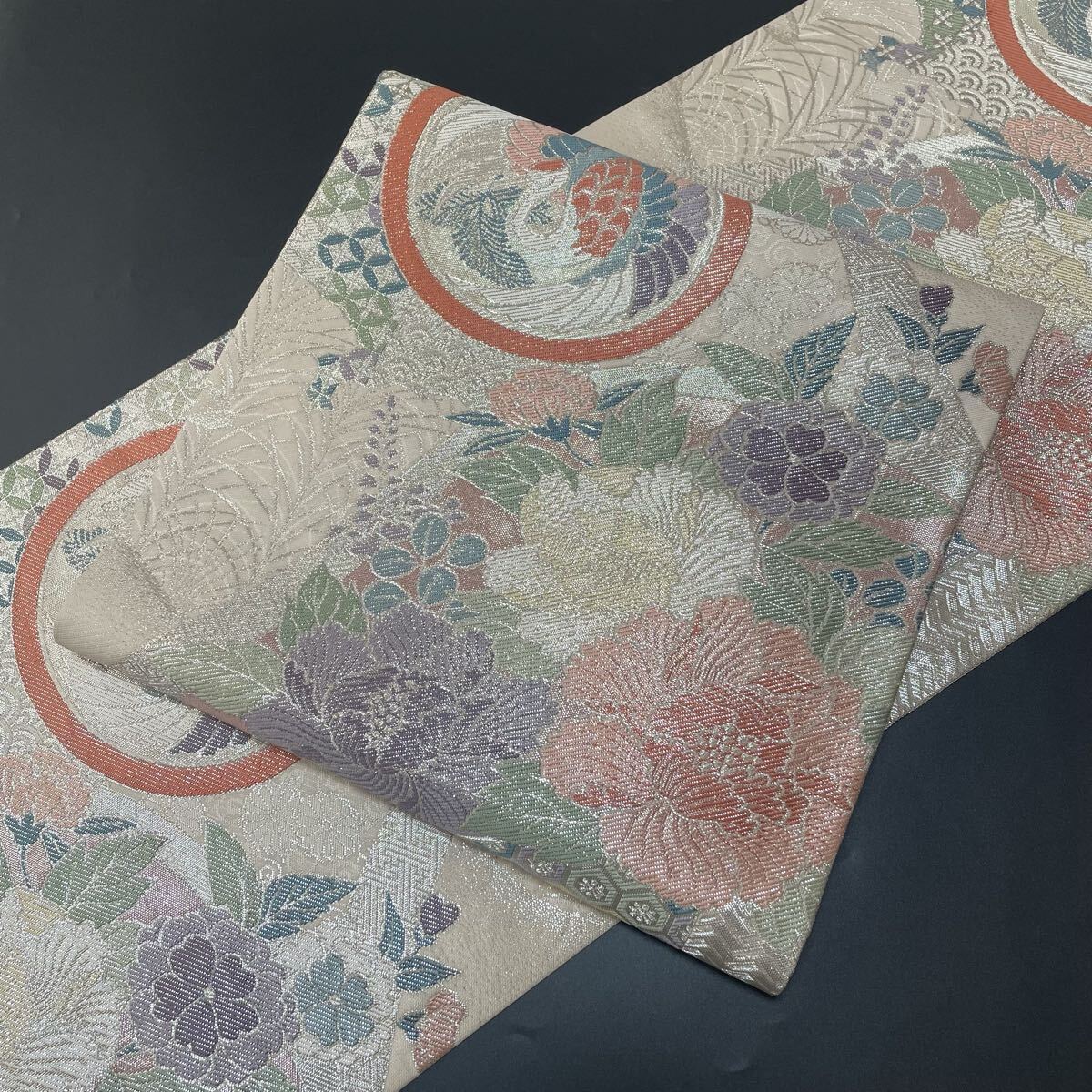 - #H988 美品 袋帯 六通 唐織 銀糸 牡丹 丸文 鶴 正絹 フォーマル帯 和装 和服【wellriver】