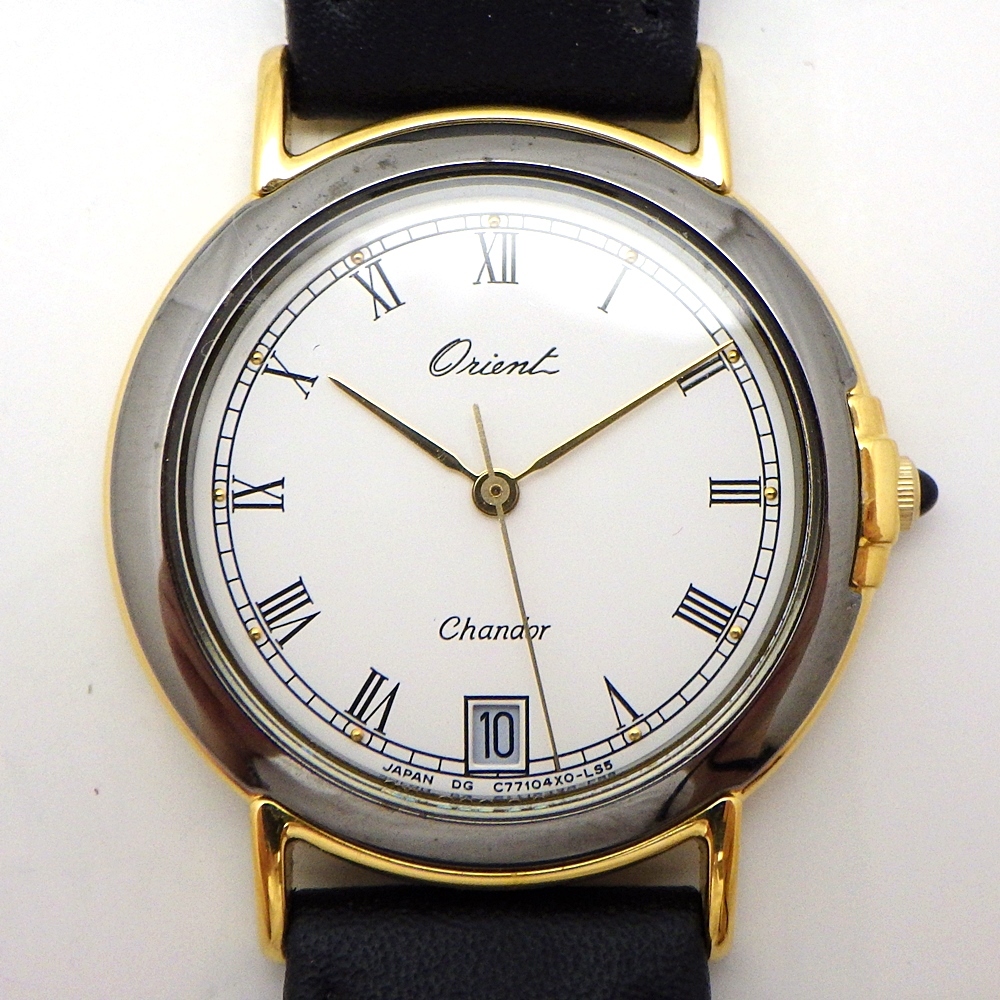 > 25-H-155【未使用】ORINET オリエント CHANDOR シャンドール 腕時計 22Kメッキ クォーツ 稼働品 ベルト社外品 ヴィンテージ デッドストック